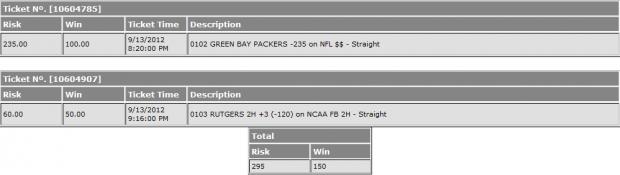 Greenbay Packers ML -235 for 1U. (Screenshot posted, late play.)