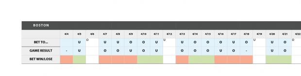 The PDF shows the full spreadsheet for the season. It's a very long file so you'll have to zoom in. This pattern is specific to BOS and doesn't work for every team. Sometimes the pattern needs to be changed during the season. The sheet shows the bet that was made based on the pattern, the outcome, and red for lost bet, green for won. Based on Bookmaker action.