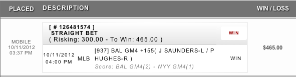 #42I hear ya but I'm not betting on Hammel he pitched great in game 1 but the NYY career batting numbers against him are BA 305 OBP 354 SLG 523-Imo it's more likely the NYY's hit him better than they did in game 1.Originally posted by swankkOk then. Still doesn't make the O's invalid tonight. The reason they won the 1st game when C.C. pitched was that 5 run outburst in the 9th off of major league best closer in 2012.Comment -
