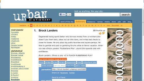 | Degenerate losing sports bettor who borrows money from co-workers and doesn't pay them back, takes out car title loans, and writes bad checks to chase his losses. He only plays big public favorites and square parlays. He likes to gamble and post on gambling forums while on family vacation. When you see a Brock Landers "Rubberband Play", pound the opposite side with confidence. Brock Landers: Illinois is only -6? A FUKKIN RUBBERBAND PLAY! |