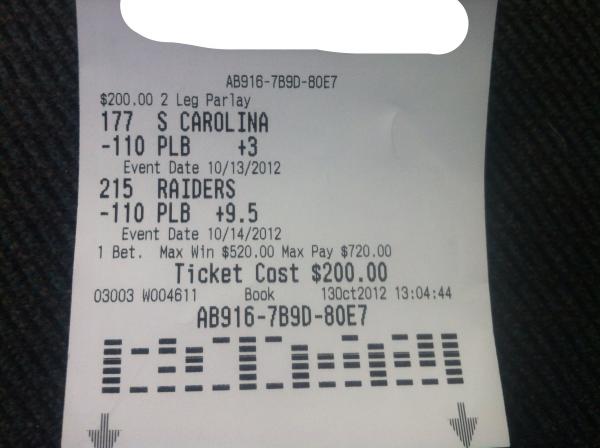 | 48929928-1 | 10/11/2012 10:18PM | Parlay | 5.00 | 632.44 | Football - 210 Cleveland Browns +115 for Game Football - 219 Detroit Lions +165 for Game Football - 224 Seattle Seahawks +155 for Game Football - 229 NYG Giants +225 for Game Football - 231 Green Bay Packers +170 for Game |