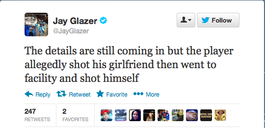 You guys hear about this? They did not name him but apparently he killed his GF then drove to his stadium and killed Himself there.Comment -