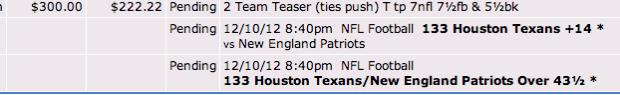 Going 7 point teaser: Texans +14 and Over 43.5. $300 to win $222.22Comment -