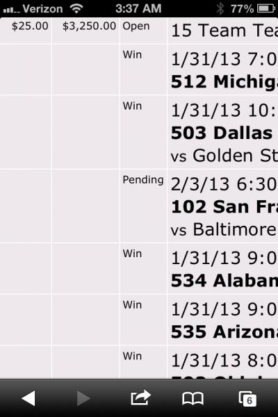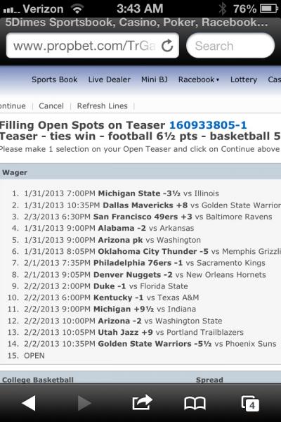 So now all I need is the Niners +3 and one more open spot left. This teaser pays more than my 25 team parlay I posted bout and help fill here December of 2011.