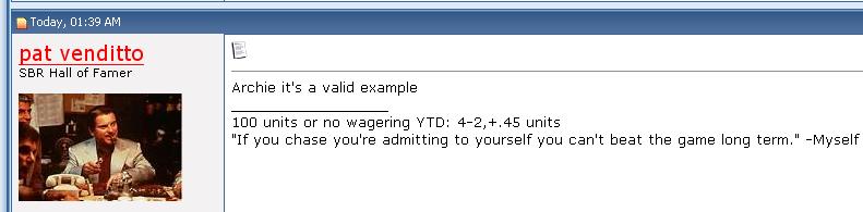 in the longrun On VD's philo picks doesn't matter, cuz if he actually had $$$$...and he bet these this year... he'd be living quite large for a year at least... no doubt.....and I think most gamblers would take that..