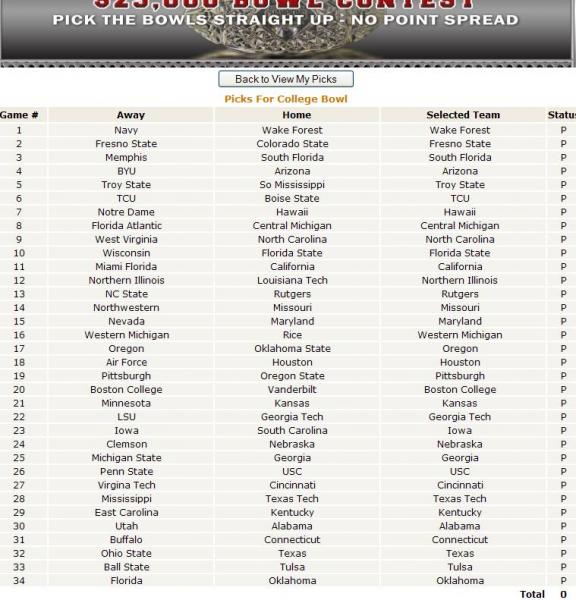 The contest is closed to entry's after the first College Bowl Game kicks off on Saturday. Make your picks and cheer your picks through the Bowl Season.