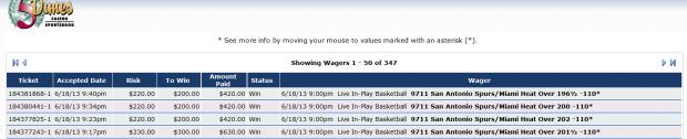 | 182883794-4 | 6/6/13 8:20pm | $100.00 | $195.00 | Pending | 6/6/13 9:00pm Reduced Basketball 881 San Antonio Spurs (Series) +195* <small>vs</small> Miami Heat (Series) | |
