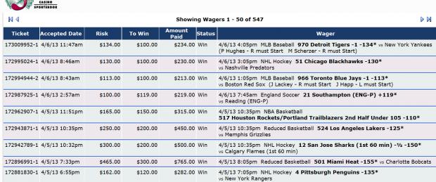 173013674-1 4/6/13 12:04pm $20.00 $1,012.10 Pending 5 Team Parlay Pending 4/6/13 7:05pm NHL Hockey 57 Tampa Bay Lightning/New York Islanders Under 5½ +100* Pending 4/6/13 7:05pm NHL Hockey 59 New York Rangers/Carolina Hurricanes Under 5 +125* Pending 4/6/13 7:05pm NHL Hockey 63 Toronto Maple Leafs (1st 60 min) -½ +177* <small>vs</small> New Jersey Devils (1st 60 min) Pending 4/6/13 7:35pm NHL Hockey 65 Washington Capitals (1st 60 min) -½ +130* <small>vs</small> Florida Panthers (1st 60 min) Pending 4/6/13 10:05pm NHL Hockey 69 Calgary Flames/Vancouver Canucks Under 5½ -125* Comment -