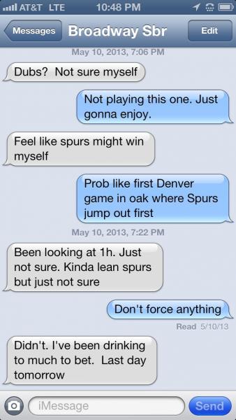 #48I bet the Spurs live in game 3 and got a few really nice lines. +190 1Q and a +110 ML for the game. Plan on doing the same thing for game 3. If the warriors jump out to an early lead I'll gladly bet the Spurs, if it doesn't work out that way I'll probably just sit the game out.Originally posted by Dollars2DonutsI was on Spurs +2.5 and Spurs ML (posted well before game time).....I am not a fan of either team and hold no bias. I have a prediction that may surprise some.....first off, of course Curry will play....secondly: