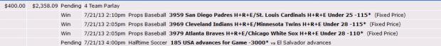 | 7/30/13 9:29am | $800.00 | $609.52 | $0.00 | Loss | 2 Team Parlay | |