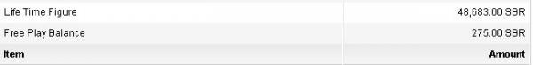 #73Current Balance 0.82 SBR Available Balance 0.82 SBR Amount at Risk 0.00 SBR Last Week`s Win/Loss Figure 0.00 SBR This Week`s Win/Loss Figure 0.00 SBR Life Time Figure 1,418.82 SBR Free Play Balance 0.21 SBR Comment -