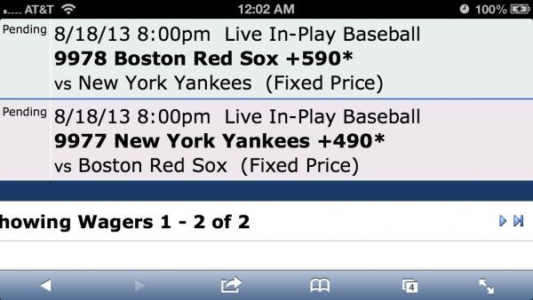 | 191320736-1 | 8/18/13 7:24pm | $400.00 | $448.00 | $848.00 | Win | 8/18/13 8:05pm MLB Baseball 977 New York Yankees +112* <small style="padding-top: 0px; padding-right: 0px; padding-bottom: 0px; padding-left: 0px; margin-top: 0px; margin-right: 0px; margin-bottom: 0px; margin-left: 0px; ">vs</small> Boston Red Sox (C Sabathia - L must Start R Dempster - R must Start) |