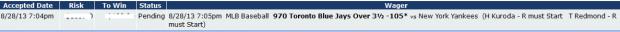 Jeter is back and the line up looks to be in good form again. Soriano put on those Yankee pinstripes and looks like Soriano from 2003. A-Roid and Grandy hitting too. Hiroki Kuroda has pitched well in his two starts against Toronto this year and Blue Jays starter is mediocre at best.