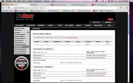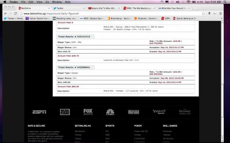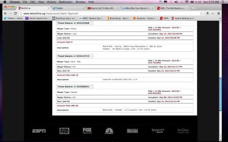 Losses: Nebraska ML (WTF was I thinking?), Kansas ML (small bet because I wanted to see how Rice looked before I bet the Bayou Bucket next week), Wisky ML, Four-team plus-money ML parlay: Louisville, Ga Tech, South Carolina and Sandusky U.