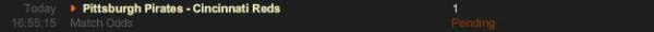 2-1 10/1/13 6:08pm $381.80 $274.69 Pending 10/1/13 8:05pm MLB Baseball 902 Pittsburgh Pirates -139* <small style="padding-top: 0px; padding-right: 0px; padding-bottom: 0px; padding-left: 0px; margin-top: 0px; margin-right: 0px; margin-bottom: 0px; margin-left: 0px; ">vs</small> Cincinnati Reds (J Cueto - R must Start F Liriano - L must Start) Comment -