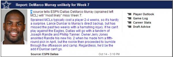 | Dallas | <center> RB </center> | DeMarco Murray | knee | OUT | 6 | 15.2 | 71.3 | 3 | 2 | 4 |