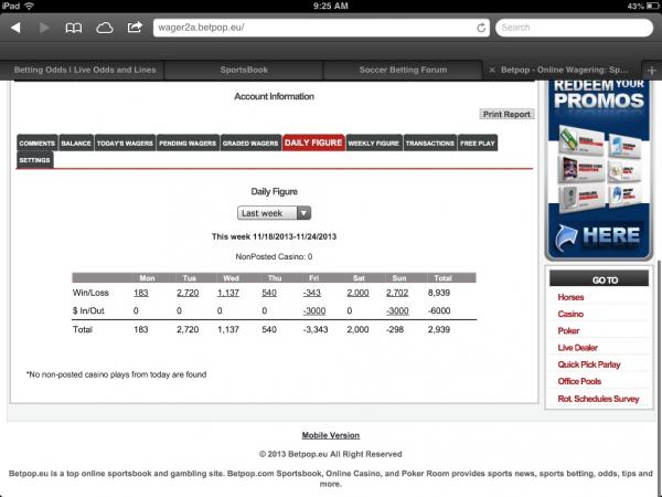 #13I had a string of 8 winning Sundays in a row some good wins to. Yesterday I got killed I tried to cut my loss in half by bailing out on Denver -1.5 you know what happen there. I also dropped in BTP from 3 to 20th