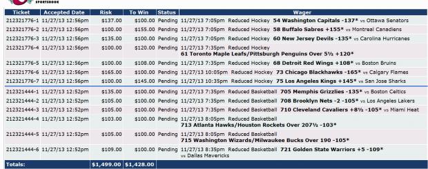| 212321444-6 | 11/27/13 12:52pm | $109.00 | $100.00 | Pending | 11/27/13 8:35pm Reduced Basketball 721 Golden State Warriors +5 -109* <small>vs</small> Dallas Mavericks | |