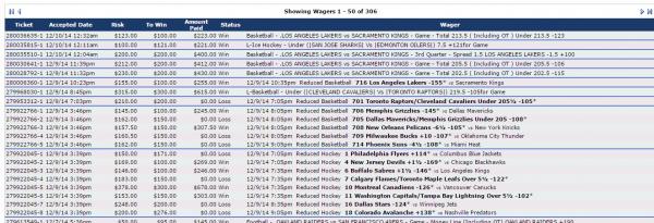 | 280815572-1 | 12/14/14 12:57pm | $210.00 | $200.00 | Pending | 12/14/14 1:00pm Reduced Football 307 Jacksonville Jaguars/Baltimore Ravens Under 44½ -105* | |