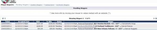 #568216553355-1 12/15/13 5:34pm $107.00 $100.00 Pending 12/15/13 6:05pm Reduced Basketball 801 Houston Rockets -6½ -107* <small style="padding: 0px; margin: 0px;">vs</small> Sacramento Kings 216553355-2 12/15/13 5:34pm $160.00 $100.00 Pending 12/15/13 6:05pm Reduced Basketball 805 Portland Trailblazers -160* <small style="padding: 0px; margin: 0px;">vs</small> Detroit Pistons 216553355-3 12/15/13 5:34pm $51.50 $50.00 Pending 12/15/13 8:05pm Reduced Basketball 809 New Orleans Pelicans +7 -103* <small style="padding: 0px; margin: 0px;">vs</small> Denver Nuggets Comment -