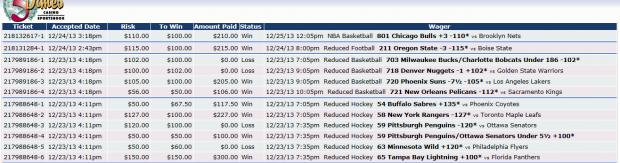 218132617-3 12/24/13 3:18pm $110.00 $100.00 Pending 12/25/13 5:00pm NBA Basketball 805 Miami Heat -8½ -110* <small>vs</small> Los Angeles Lakers 218132617-4 12/24/13 3:18pm $110.00 $100.00 Pending 12/25/13 10:35pm NBA Basketball 809 Los Angeles Clippers +2 -110* <small>vs</small> Golden State Warriors 218132617-5 12/24/13 3:18pm $110.00 $100.00 Pending 12/25/13 10:35pm NBA Basketball 809 Los Angeles Clippers/Golden State Warriors Under 204½ -110* Comment -