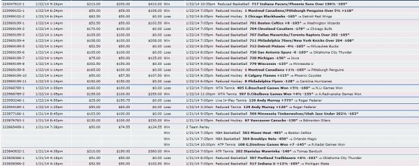 #1306223969199-1 1/22/14 1:14pm $52.50 $50.00 Pending 1/22/14 7:05pm Reduced Basketball 701 Boston Celtics +9 -105* <small>vs</small> Washington Wizards 223969199-2 1/22/14 1:14pm $170.00 $100.00 Pending 1/22/14 7:05pm Reduced Basketball 704 Cleveland Cavaliers -170* <small>vs</small> Chicago Bulls 223969199-3 1/22/14 1:14pm $105.00 $100.00 Pending 1/22/14 7:05pm Reduced Basketball 707 Dallas Mavericks/Toronto Raptors Over 202 -105* 223969199-4 1/22/14 1:14pm $108.00 $100.00 Pending 1/22/14 7:35pm Reduced Basketball 711 Philadelphia 76ers/New York Knicks Over 204 -108* 223969199-5 1/22/14 1:14pm $52.50 $50.00 Pending 1/22/14 8:05pm Reduced Basketball 713 Detroit Pistons -4½ -105* <small>vs</small> Milwaukee Bucks 223969199-6 1/22/14 1:14pm $105.00 $100.00 Pending 1/22/14 8:05pm Reduced Basketball 720 San Antonio Spurs -6 -105* <small>vs</small> Oklahoma City Thunder 223969199-7 1/22/14 1:14pm $75.00 $50.00 Pending 1/22/14 7:00pm Reduced Basketball 730 Michigan -150* <small>vs</small> Iowa 223969199-8 1/22/14 1:14pm $202.50 $150.00 Pending 1/22/14 9:00pm Reduced Basketball 779 Wisconsin -135* <small>vs</small> Minnesota U 223969199-9 1/22/14 1:14pm $165.00 $100.00 Pending 1/22/14 7:05pm Reduced Hockey 1 Montreal Canadiens +1½ -165* <small>vs</small> Pittsburgh Penguins 223969199-10 1/22/14 1:14pm $50.00 $57.50 Pending 1/22/14 9:35pm Reduced Hockey 6 Calgary Flames +115* <small>vs</small> Phoenix Coyotes 223969199-11 1/22/14 1:14pm $192.00 $150.00 Pending 1/22/14 6:05pm Reduced Hockey 8 Philadelphia Flyers -128* <small>vs</small> Carolina Hurricanes 223968789-1 1/22/14 1:09pm $160.00 $100.00 Pending 1/22/14 7:00pm WTA Tennis 405 E.Bouchard Games Won +5½ -160* <small>vs</small> N.Li Games Won 223968789-2 1/22/14 1:09pm $155.00 $100.00 Pending 1/22/14 11:00pm WTA Tennis 507 D.Cibulkova Games Won +4½ -155* <small>vs</small> A.Radwanska Games Won 223840632-1 1/21/14 4:38pm $210.00 $150.00 Pending 1/22/14 7:00pm ATP Tennis 202 Stanislas Wawrinka -140* <small>vs</small> Tomas Berdych Comment -