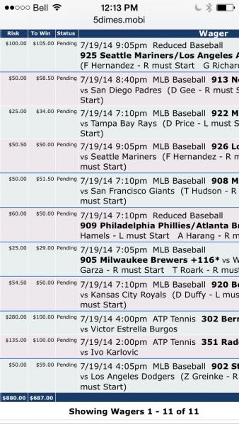 As for MLB, things are still looking decent as long as the Angels win. I had a huge amount late on the Angles and the A's but didn't get it posted so it won't count to my win/loss record.Comment -
