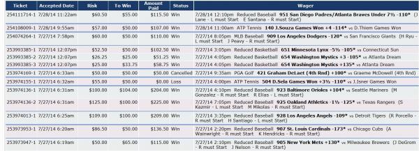 | 254100023-3 | 7/28/14 12:58am | $53.50 | $50.00 | Pending | 7/28/14 8:05pm Reduced Baseball 965 New York Yankees/Texas Rangers Under 8 -107* (D Phelps - R must Start Y Darvish - R must Start) | |