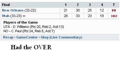 #11I had the over on Jazz game too. I told you in the PM that the final will be 217 or 219.Comment -