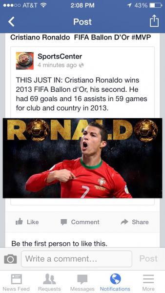 #29exactly. ronaldo can also play any position on the field except for center defense or goalie. ppl are so dumb on messis nuts he gets the ball played to him in or around the box 30 times a game where ronaldo goes and gets it himselfOriginally posted by VaughanyRonaldo can head the ball as well! He'd of buried the chance tht messi had against atletico!