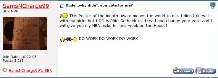 Sammy...please refrain from PMing me to reversemy vote...your one weekNBA package will not change my mind. Thanks anyways