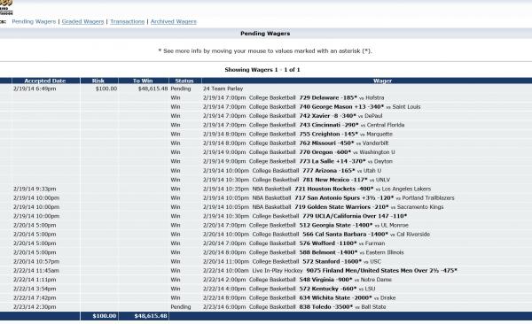 2/23/2014 7:41AM Money Line 1,723.88 2,241.04 Basketball - 823 Northern Illinois +130 for Game Comment -