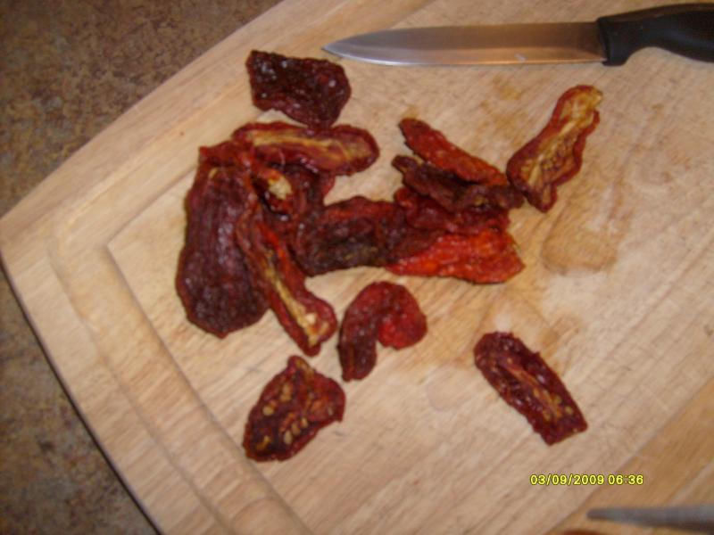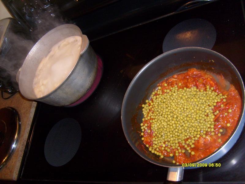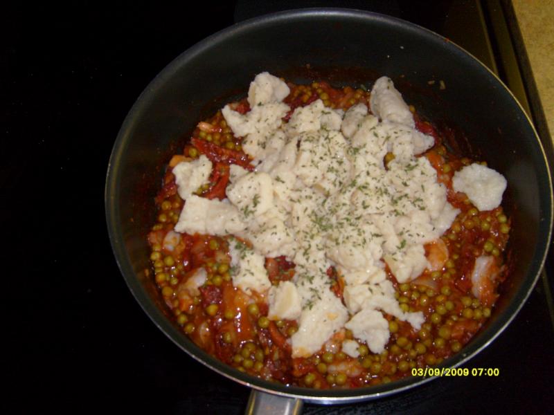 Homemade pasta (boiled in chicken broth) with sundried tomatoes, peas, shrimp, garlic and onions.