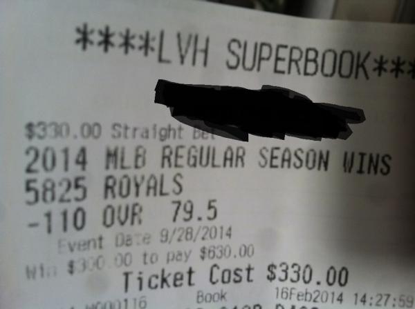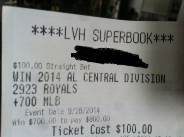 | 3/30/14 9:06pm | $50.00 | $175.00 | Pending | 3/31/14 1:00pm Props Baseball 25343 Kansas City Royals win AL Central +350* <small style="padding: 0px; margin: 0px;">vs</small> Field wins American League Central (Fixed Price) |