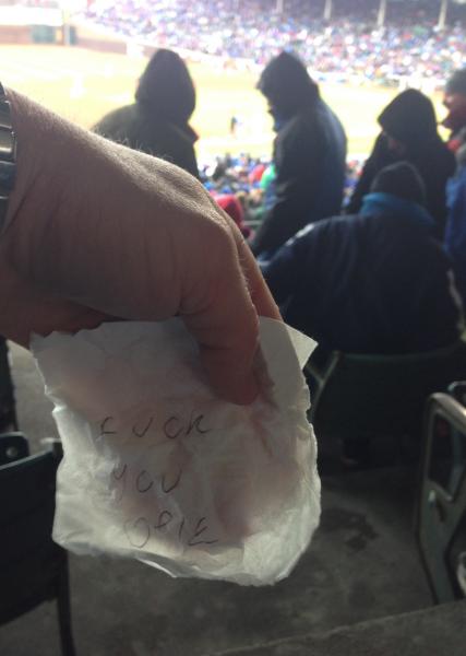You prove it, motherfukker. All it takes is just a simple sign in a pic. Just scribble "Fukk you Opie" on a napkin, and take a pic of it somewhere we can tell you're really at Wrigley.