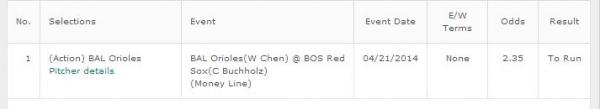 #69160-1 4/21/14 1:20pm $400.00 $248.45 Pending .L-Baseball Props Apr 21 2014 - .Baseball - .BOSTON RED SOX vs BALTIMORE ORIOLES - Game - Total 11.5 ( OT included ) - Under +11.5 -161 Comment -