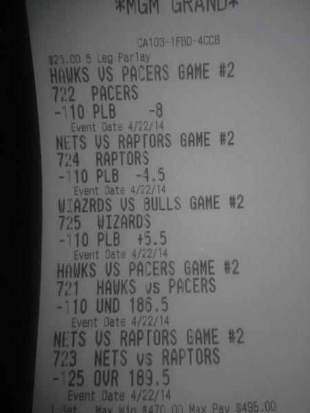 | 239946031-1 | 4/22/14 4:21pm | $33.00 | $30.00 | $63.00 | Win | 4/22/14 7:35pm NBA Basketball 724 Toronto Raptors Over 97½ -110* <small style="padding: 0px; margin: 0px;">vs</small> Brooklyn Nets |