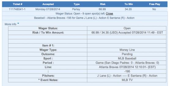 | Line: | Atlanta Braves 07/28/2014 12:10:01- (EST) |