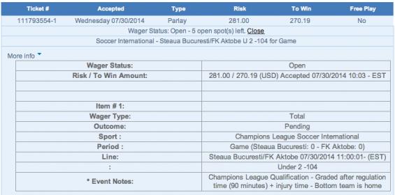 | Risk / To Win Amount: | 66.99 / 1,603.94 (USD) Accepted 07/28/2014 11:49 - EST |