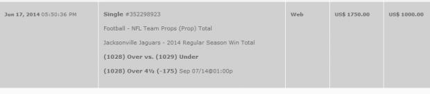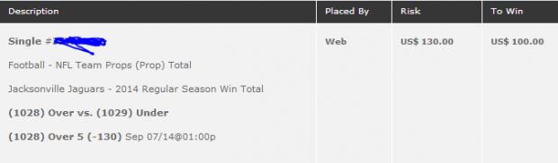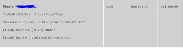 Its at 5 (Over -130) on Blovada right now....4.5 (Over -215) on 5dimes. I'm from J-ville, and although it hurts to say, I've made a killing the last few years betting against my Jags. I was the conductor of the Jags fade-train last season, where we saw great success with the Jags starting the season 0-5 ATS, and 1-7 ATS at the bye week, with our only cover being the highest point spread in NFL history (27.5) against the Broncos. Then disaster struck. Blaine "Chuck n Duck" Gabbert was benched for Chad Henne, and they preceded to go 4-4 SU over their final 8. The key to the Jags being historically bad last season was Gabbert, and that was proven true once he was benched. Our new Owner has proven that he is 100% committed to this team already spending over 100 Million on stadium renovations. It also takes a special coach to get an 0-8 team, being labeled one of the worst of all time, to finish 4-4. We have also made HUGE moves in the draft and free agency.