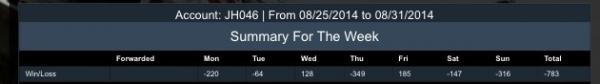 | Risked: $3,628.00 | Won: $2,037.00 | Lost: -$1,555.00 | Net: $482.00 | Win Percentage 57.58% | 19-14 |