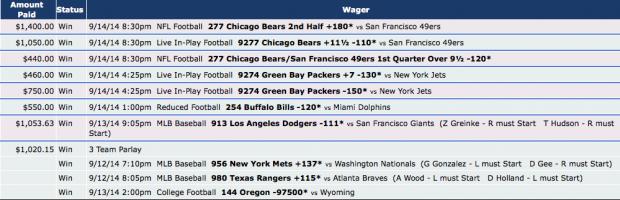 261721487-1 9/14/14 3:58pm $300.00 $300.00 $600.00 Win 2 Team Teaser (ties push) Teaser tp 6fb & 4½bk Win 9/14/14 4:05pm NFL Football 270 San Diego Chargers +10½ * <small style="padding: 0px; margin: 0px;">vs</small> Seattle Seahawks Win 9/14/14 4:25pm NFL Football 274 Green Bay Packers -1½ * <small style="padding: 0px; margin: 0px;">vs</small> New York Jets Comment -