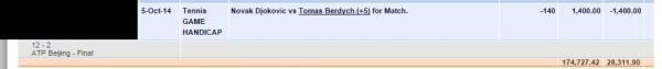 So I had one of my best ROIs in recent years last month. Then I managed to get on the wrong side of the ATP Beijing Final this morning - may be the worst loss I have ever had on any sports play in terms of final outcome.