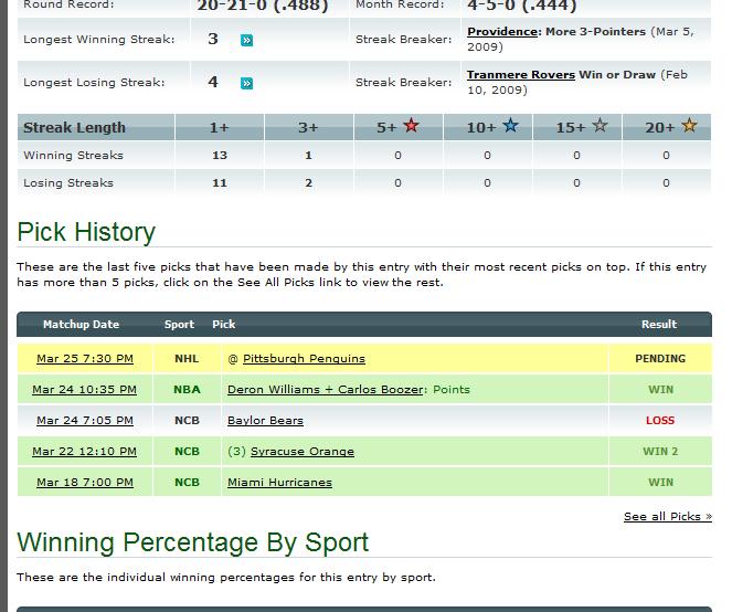 #20I quit picking on March 12 because I figured I had no shot at winning anything, but I got sucked back in this week. Too addictive. I now have a 5 game streak.