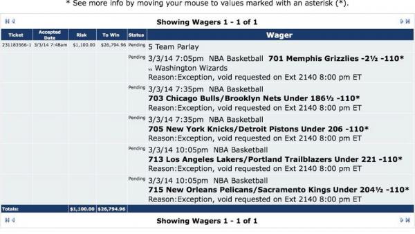 I accidentally did a 5team parlay cuz my auto-fill password confirmed the bet and I hit ENTER by mistake lol. I panicked and called 5dimes to be put on hold for 10mins. Then they said they will wont cancel a bet again but it MOTHA EFFIN HIT!!!! [ATTACH]74225[/ATTACH] $1100 to win almost $27K