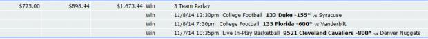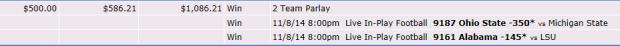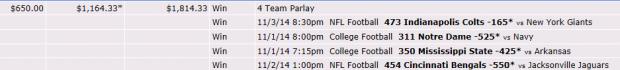 #221k bet on these 4 games will win you 2900 net! Not bad odds in my eyes. Auburn is a lock and will probably win outright. Ohio State is rolling on offense and defense. Mich St will crush Maryland even though its an early game. So the only toss up game is FSU. I hate Winston but he damn sure always pulls it out.Comment -
