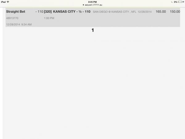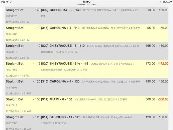 Will double up or more if it moves much more.283638996-1 12/28/14 7:53pm $100.00 $112.00 Pending 12/28/14 8:30pm Reduced Football 306 Pittsburgh Steelers -3½ +112* <small style="padding: 0px; margin: 0px;">vs</small> Cincinnati Bengals Comment -