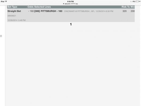 12/28/2014 5:48 PM- 115 [305] CINCINNATI -115 +3.5 CINCINNATI @ PITTSBURGH , NFL 12/28/2014 8:30 PM $0 $0 Straight Bet