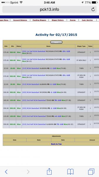 #17Wish I could double the bets. My max is 500 with my guy. That's why I'm going if win bets and if win or push bets with 20$ on the 2nd game so I can triple up the bet amount like I did with MSUOriginally posted by slo moWay to go homie! Pass some that good fortune my way, I really could use a streak like that right NOW!! double those bets to 1k a game and knock a hole in somebody's book! Penetrate those haters and get that cake baby boy!Comment -