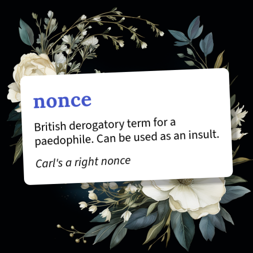 nonce: British derogatory term for a paedophile. Can be used as an insult.